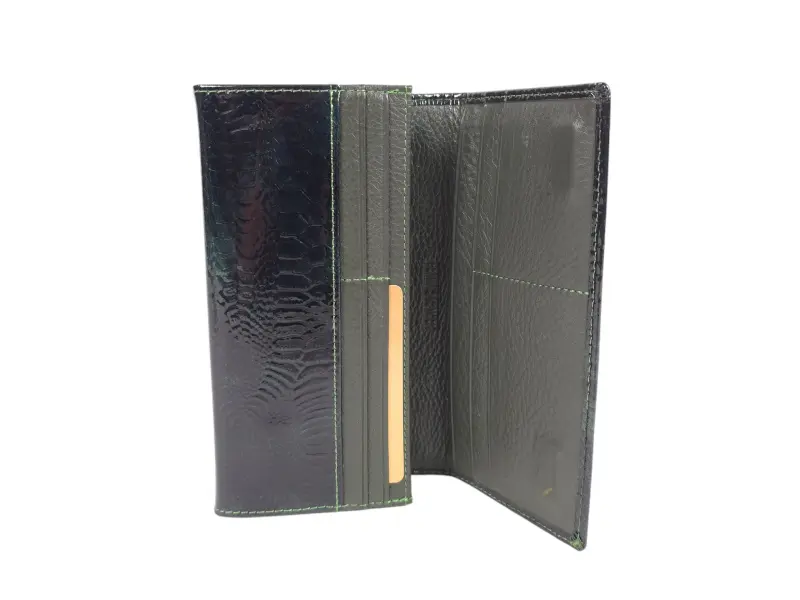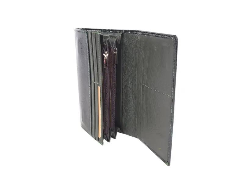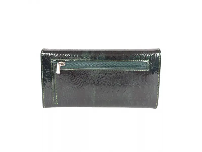 Зелено дамско портмоне от естествена кожа и лак. Голямо дамско портмоне с отделения за банкноти, слотове за карти и лични документи и монетник с цип. Стилно дамско портмоне с интересен дизайн.