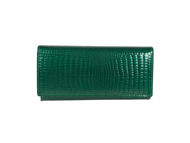 Зелено дамско портмоне от естествена кожа и лак. Голямо дамско портмоне с отделения за банкноти, слотове за карти и лични документи и монетник с цип. Красиво дамско портмоне с интересен дизайн.