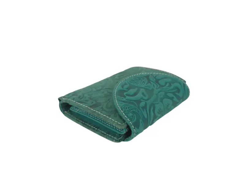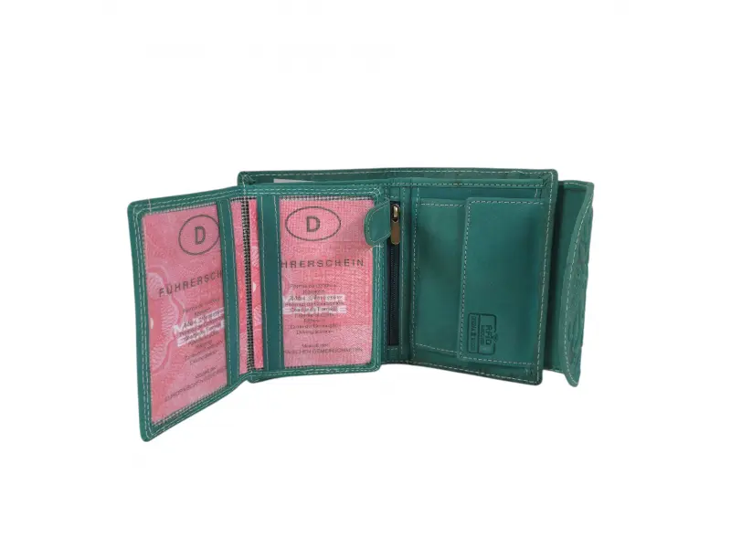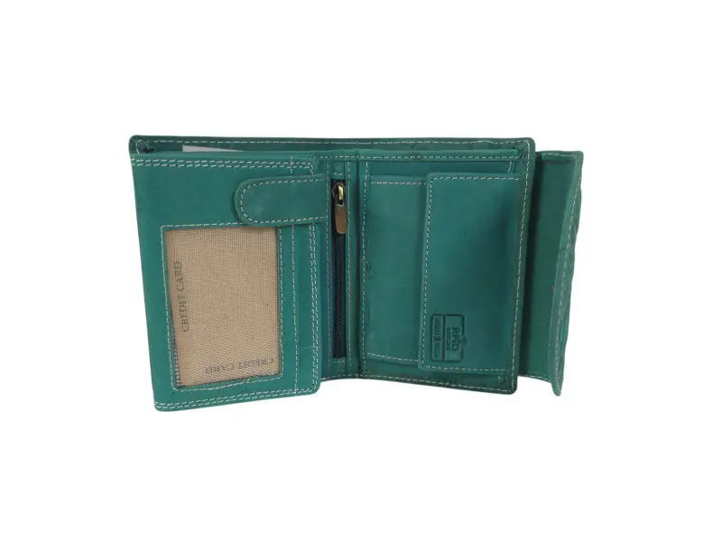 Зелено дамско портмоне от Индия - Дамско портмоне от естествена кожа. - Закопчаване с копче тик-так. - Отделения за карти. - Отделения за банкноти. - Вътрешен монетник с копче. - Вътрешен джоб с цип. - Заден джоб с цип.
