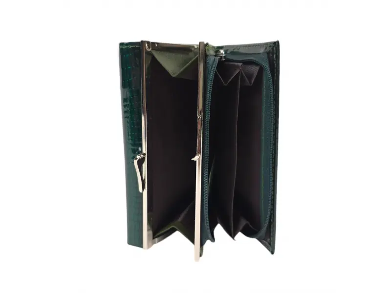 Стилно дамско портмоне в маслено зелен цвят - Дамско портмоне от естествена кожа и лак. - Отделения за банкноти. - Отделения за карти и лични документи. - Отделения за монети с щипка. - Отделение за монети с цип.