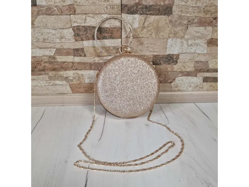 Елегантна чанта в кръгла форма - Официална дамска чанта с едно отделение. - Отваряне и затваряне с механизъм. - Златен кант. - Дръжка за носене в ръка. - Дълга дръжка тип верижка.