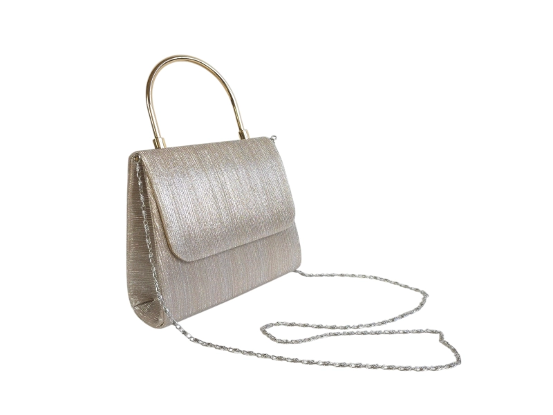 Златна чанта с елегантен дизайн - Официална дамска чанта с едно отделение. - Отваряне и затваряне с магнит. - Дръжка за носене в ръка. - Дълга дръжка тип верижка.