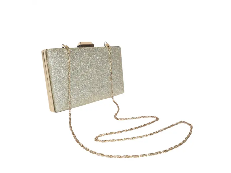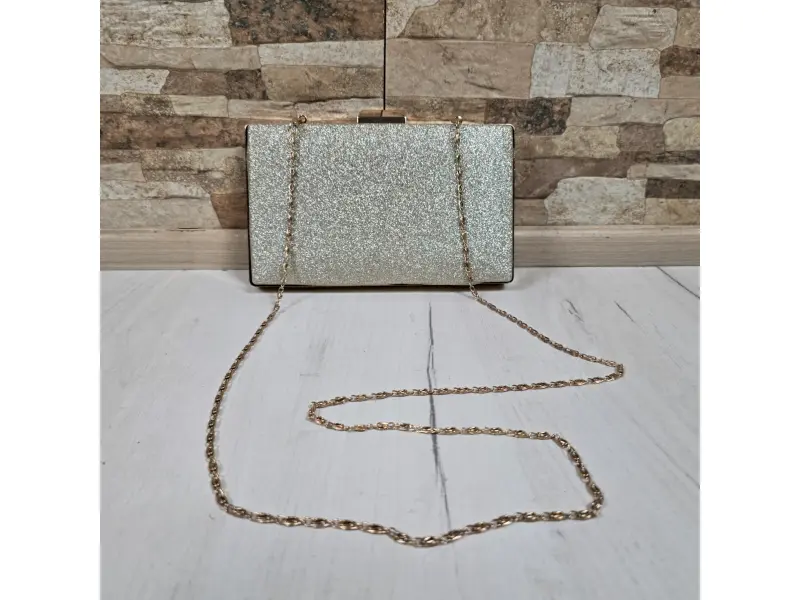 Златна блестяща чанта - Официална дамска чанта с едно отделение. - Отваряне и затваряне с механизъм. - Сребърен кант. - Дълга дръжка тип верижка.